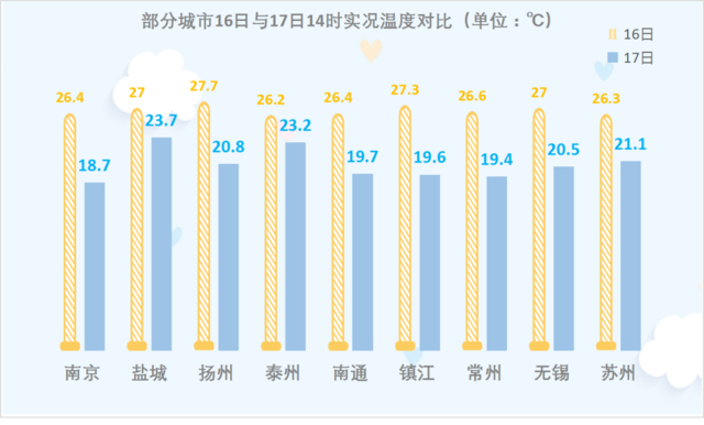 虽然雨不大,但气温下降挺明显的,尤其沿江以南地区。对比上述地区16日和17日14时的实况温度,大部分地区的气温降幅都超过了5℃。这不,到手的夏天又飞走了。