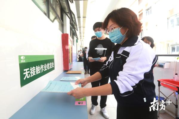 在深圳外国语学校初中部,南方+记者看到教室内摆放单人桌椅,教室外走廊处设置了“无接触作业收发处”,还安置了临时洗手台,配有抑菌洗手液、免洗消毒液、以及纸巾、垃圾桶,并张贴“七步洗手法”,培养、规范学生洗手习惯。