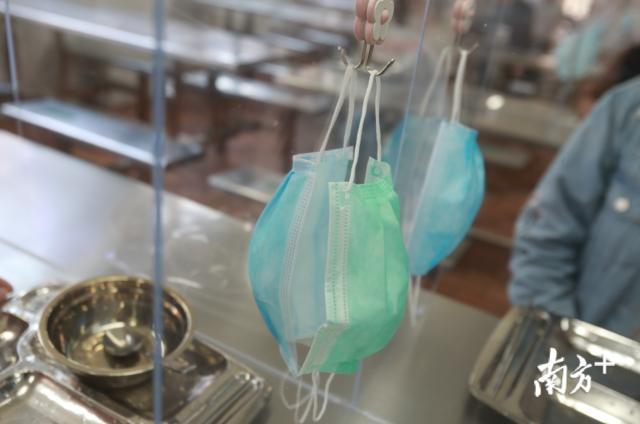在深圳外国语学校初中部,餐厅设好数条通道,通道地面每隔1米粘贴排队站位标志和取餐后返回路线标志。学生排队取餐,领餐后,分区域用餐,交错间隔就坐。在每张餐桌上有安装专门的隔板,为防止学生吃饭时飞沫传播等。隔板上还贴心的安装小挂钩,供学生放置口罩。