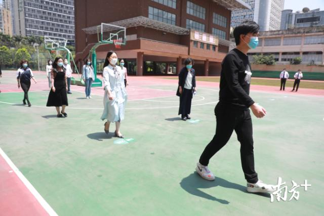 深圳外国语学校初中部要求在疫情期间,学生按常规做操锻炼,广播体操做完后不收队,按原有通道返回教室,学生间间距1米以上。做操时,学生要从不同通道有序下楼,间距1米以上,并佩戴口罩。体育老师整队入场后进一步拉开间距,距离达到1.5米。