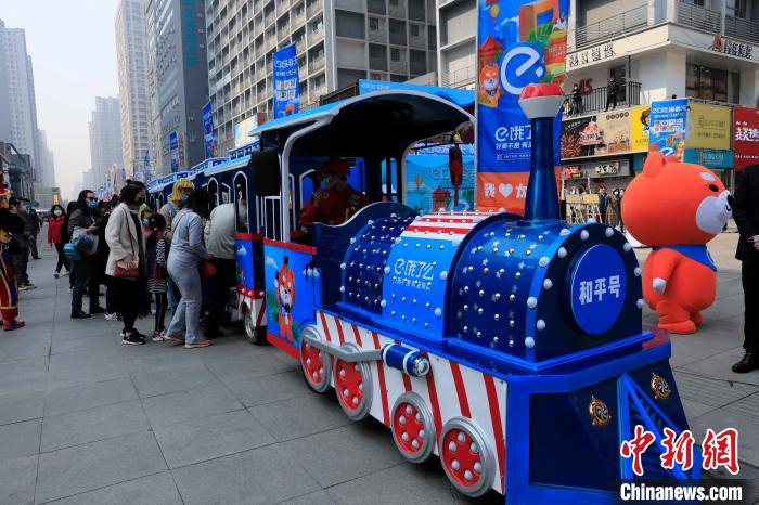 4月18日活动现场,人们乘坐五彩小火车逛太原街。 沈殿成 摄