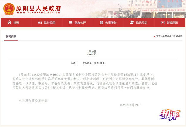 原阳县委宣传部4月19日凌晨在原阳县政府官网发布通报,4月18日17点30分至22点40分,在原阳县盛和府小区堆放的土方中陆续发现4名5至11岁儿童尸体,均系与该小区相邻的原阳县原兴办事处温庄村人。经初步判断,可能因土方压埋窒息死亡,具体原因需要进一步调查。事发后,市县两级党委、政府高度重视,迅速组成联合调查组展开调查。