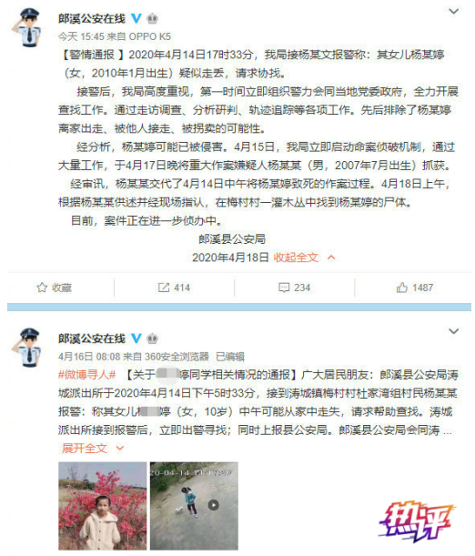 一起发生在安徽省郎溪县。当地警方发布通告,此前走失的10岁女孩杨某婷被12岁男孩杨某某侵害遇难。18日上午,根据杨某某供述并经现场指认,警方在梅村村一灌木丛中找到杨某婷的尸体。被害人与嫌疑人系堂兄妹关系。同村一知情人向媒体称,女孩很可怜,从小性格老实,其母亲常年不在家。据悉,郎溪县公安局已将案件移交上一级公安机关办理,具体案情暂时不便透露。