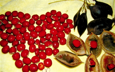 红豆树结的种子又名相思子,秋末结果,剥开豆荚,便是一粒粒心形的鲜艳红豆,千百年来,牵系着无数痴情男女的悠悠情思。