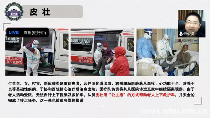 “在与疫情战斗中,一批武大人临危不惧、义无反顾,以医者的使命感和责任感,站在战疫的最前线。”朱俊勇用窦贤康校长的话为引,用最美逆行者形容武大医者。