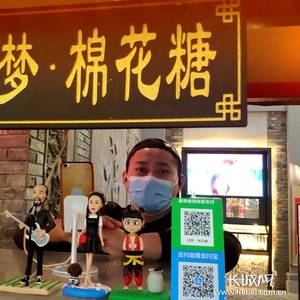 1992年出生的小胡以前一直在建筑工地做电工,去年和妻子一块来到石家庄打拼。他们在勒泰地下一层租了摊位,小胡卖棉花糖,妻子做软陶人偶和糖人。