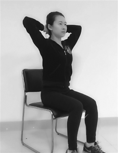 动作要领:坐在椅子上,上体正直。挺胸吸气,张开双臂,双手掌心朝上向后伸展。慢慢呼气,收回双臂,曲臂,手肘用力朝后夹紧,拇指向后伸。10次为一组,完成3~5组,组间休息1分钟。