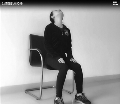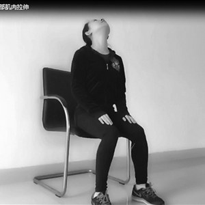 动作要点:坐在椅子上,上身正直。头部分别向前弯曲、向后弯曲、向左右方向转看:向前时下巴尽可能接触胸部,向后时鼻子尽可能正对天花板;向左向右看时,尽力看向两侧。在最大伸展位置保持5~10秒后慢慢还原,每个方向做两次。