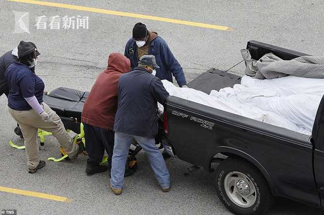 与此同时,上周日,在美国的费城,一家医院被曝出用皮卡车大白天运送大量尸体。有照片显示,一辆福特皮卡上满载用布包裹的尸体,尸体随便摆放,一个摞一个,皮卡在市验尸官办公室门前停了下来。验尸官办公室的一名职员紧张地来到皮卡前,帮助司机将尸体从皮卡上卸到推车上,然后再将尸体运到附近停放的三辆临时冷藏拖车上。