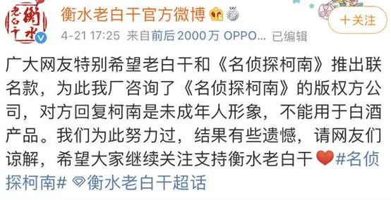 原标题:衡水老白干联名柯南失败,原因是“柯南还未成年”