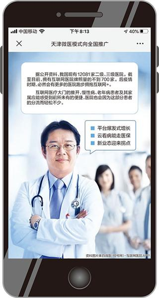今年2月,天津市医保局制定出台了《关于在新冠肺炎疫情防控期支持定点医疗机构开展互联网诊疗服务的通知》,在全国范围内率先在省级层面打通互联网诊疗服务医保线上报销渠道,支持定点医疗机构开展在线咨询、在线诊疗等互联网诊疗服务。