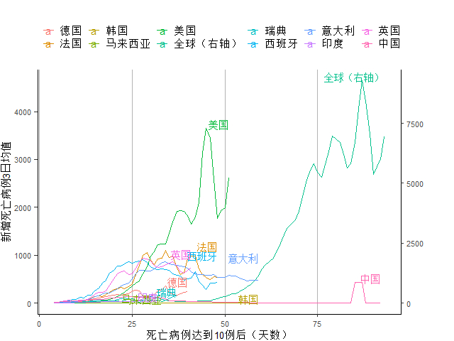 图7 死亡病例到达10例后各主要疫情国家死亡病例增长3日均值