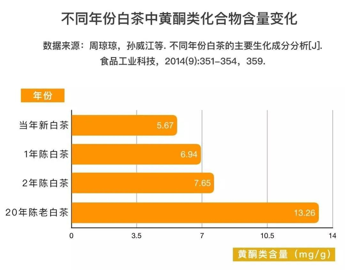 而在现代茶叶化学研究中,著名茶叶院士刘仲华指出,白茶核心成分在黄酮。黄酮是非常重要的抗氧化剂,具有抗炎抑菌的作用,尤其利于呼吸系统和心血管。而且,这个成分还会随着年份不断增加。