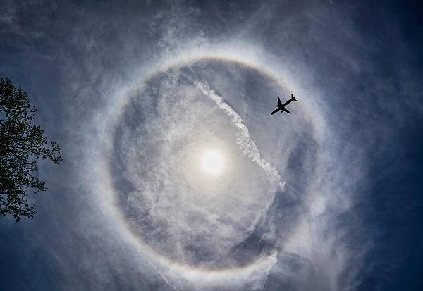因此,当这些冰晶对光进行折射后,往往在太阳周围出现一个或两个以上以太阳为中心、内红外紫的彩色光环,这就是我们所能见到的日晕。