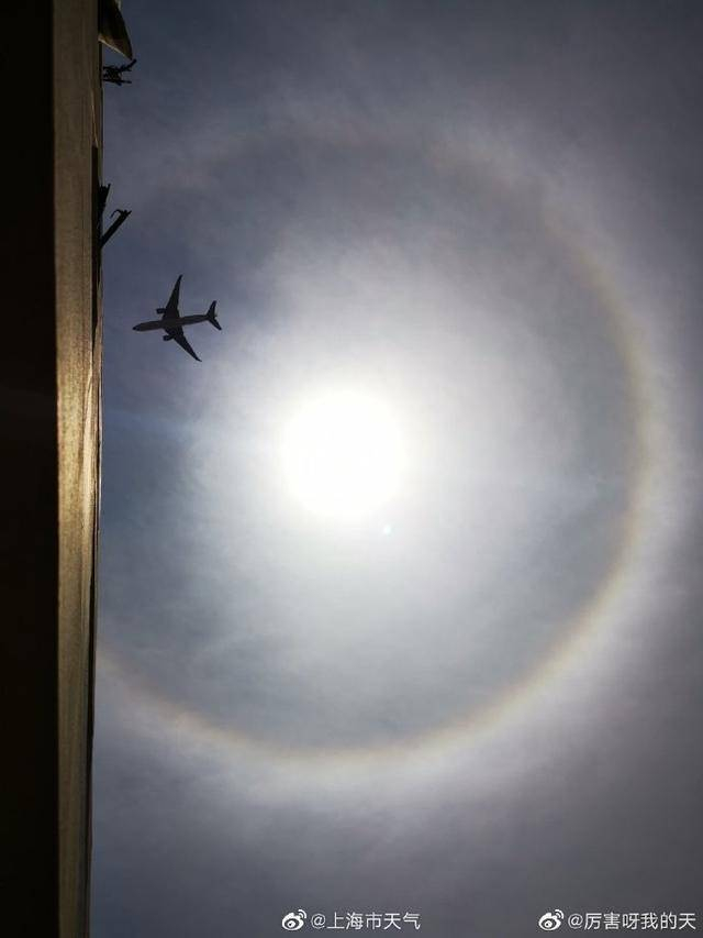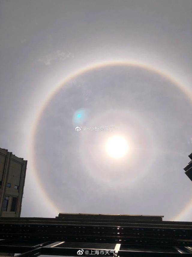 为什么少见呢?@上海市天气进行了一番科普:大家都知道,形成日晕是因为云中有冰晶。在自然条件下,云中冰晶基本上都是六角片状或柱状的。