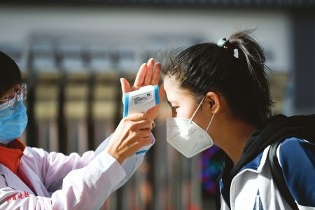 4月25日7时许,太原市育英中学的校门向同学们敞开。178名初三学子身着校服,接受体温检测后有序步入校园。此前,因不具备全封闭条件,育英中学344名高三学子在太原市第三实验中学复课。26日,高三学子将与初三学子一起回到本校校园,按原教学班复课,开启动态闭环管理、“两点一线”的学习生活。