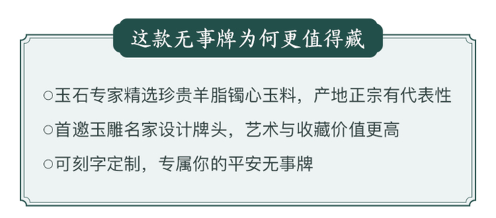 平安无事牌身干净无饰,稍有瑕疵,一眼便能看穿。要做到品相绝佳,用料就要极为考究。