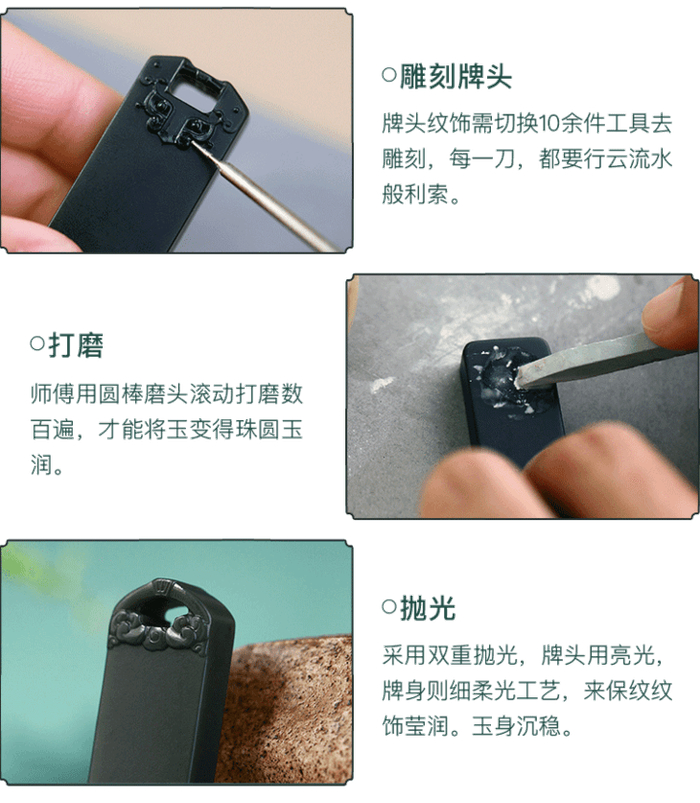 她穿越风沙和戈壁荒滩,分别去到了羊脂玉、墨青玉至为正宗的产地——昆仑山和新疆塔什库尔干,花上数月选挑,才做出这次的平安无事牌。