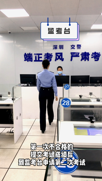 科目一理论考试共有两次考试机会,第一次不合格的,提交考试成绩后,到监考台申请第二次考试。