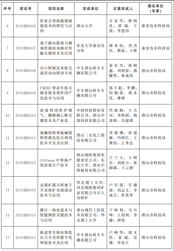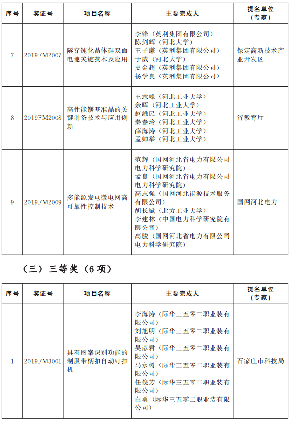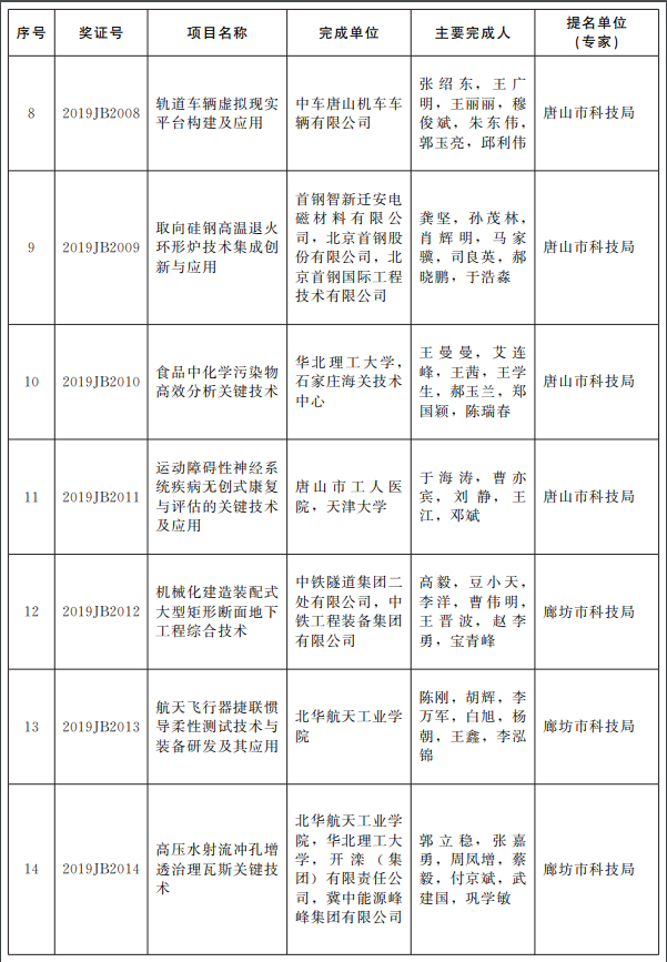 根据《河北省科学技术奖励办法》的规定,经省科学技术奖励评审委员会评审、省科学技术奖励委员会审定,报请省政府批准,授予王新东同志河北省科学技术突出贡献奖;授予“纳米材料的生物学效应及其应用基础研究”等3项成果河北省自然科学奖一等奖,授予“晚古生代黑色岩系成矿有机—无机耦合机制”等6项成果河北省自然科学奖二等奖,授予“南黄海夏季环流结构及其变化规律”等10项成果河北省自然科学奖三等奖;授予“面向核电站在役检修的耐辐照多功能水下作业机器人系统”等3项成果河北省技术发明奖一等奖,授予“动车组高压安全联锁系统”等9项成果河北省技术发明奖二等奖,授予“修井作业自动起下油管技术装备研发及应用”等6项成果河北省技术发明奖三等奖;授予“天通一号卫星移动通信系统终端核心芯片组及应用”等22项成果和长城汽车股份有限公司等2家企业河北省科学技术进步奖一等奖,授予“食品中化学污染物高效分析关键技术”等64项成果河北省科学技术进步奖二等奖,授予“航空材料用高纯五氧化二钒生产技术研究与产业化”等107项成果河北省科学技术进步奖三等奖;授予沃尔夫冈·菲斯特教授等4名外国专家和清华大学河北省科学技术合作奖。