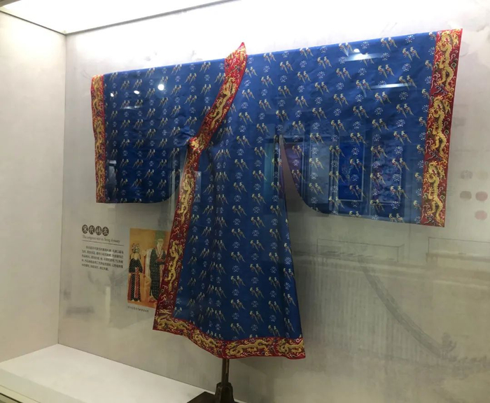 在南京江南丝绸文化博物馆,该馆以非遗工艺1:1再现了这件礼服的原貌。翟纹及小轮花图案部分均以苏州宋锦工艺完成,并以盘金绣工艺还原了服饰的领子、袖口、衣襟处金色龙纹的华丽端庄。