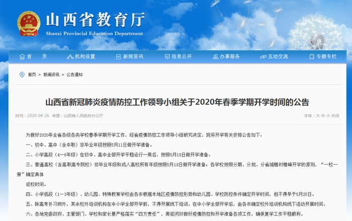 4月26日,山西省教育厅发布消息,明确全省各级各类学校春季学期开学时间。