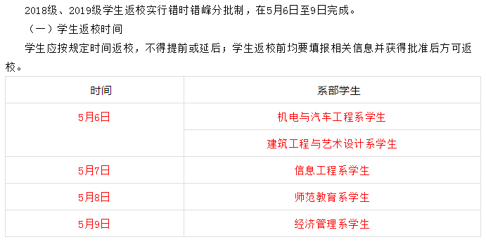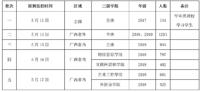 学生自5月8日起分批错峰返校。依照年级及学生类别划分,分4批次返校,总时长10天。具体返校批次及时间安排: