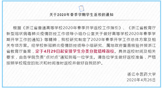 学校决定安排中医学(含骨伤)、中西医临床医学、针灸推拿学专业的省外本科毕业生分批错峰返校,返校时间为4月27日、4月28日。