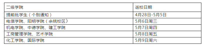 定于2020年5月6日起安排毕业年级学生分期分批有序返校,具体返校时间和有关要求由各学院(部)通知学生本人,未接到通知的一律不返校。