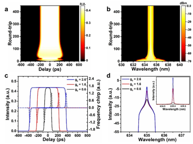 图1.可见光被动锁模光纤激光器的数值模拟结果。(a)脉冲演化;(b)相应的光谱演化;(c)脉冲时域波形(实线)和相应的频率啁啾(虚线);(d)锁模激光光谱