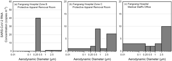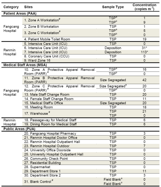 图1.医院和公共环境各采样点的新冠病毒载量(拷贝数/立方米空气)。