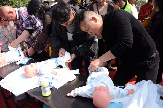 2019年3月11日,浙江台州白塔镇圳口村文化广场,奶爸为“宝宝”洗澡按摩抚触、换尿布。视觉中国供图