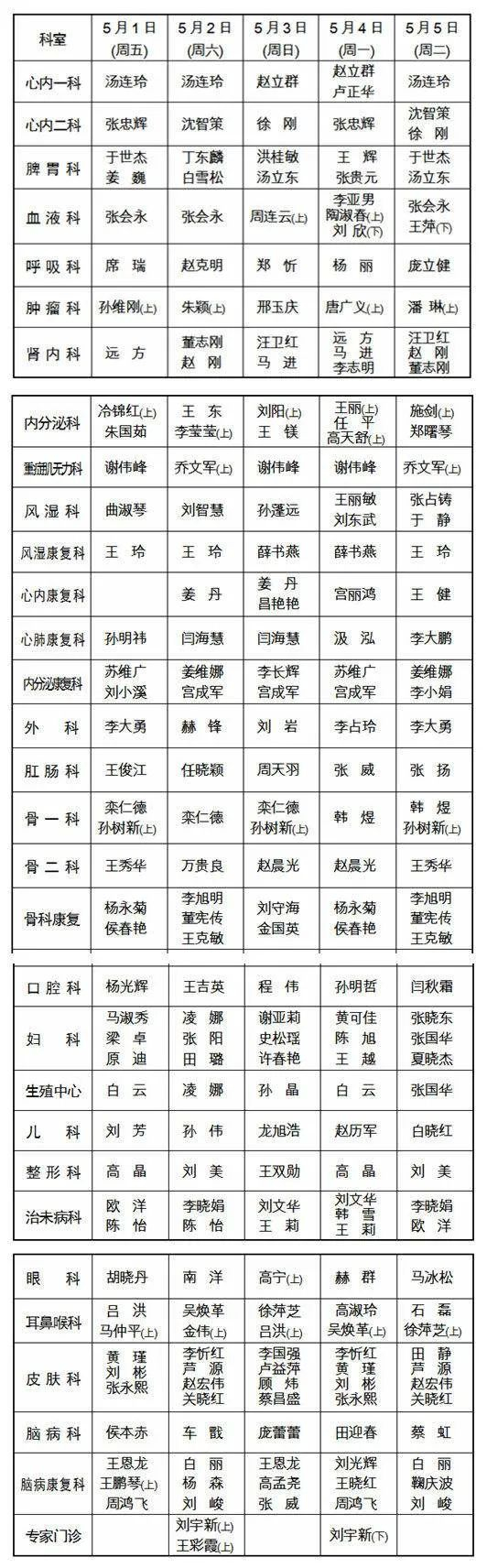 5月1日至5日,所有科室均出诊。