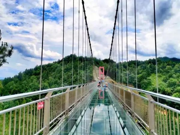 玻璃吊桥架设于深谷绝壁之上,底下是数百米高的山凹处,茂密的植被令脚下看起来幽深静谧,走在玻璃桥上,体验心跳加速的感觉。