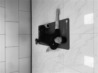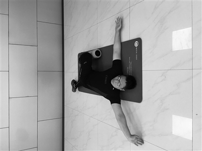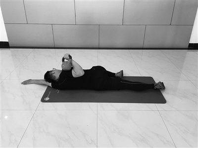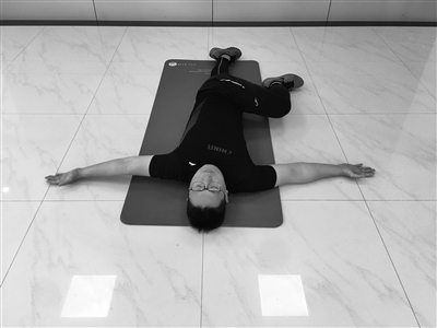请进行如图所示测试。仰卧于瑜伽垫上,一条腿跨过另一条腿并屈膝,双手侧平举打开。