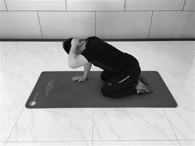 跪位三点支撑,臀部向后靠近脚跟,一侧手摸耳朵,做上背部旋转动作,注意保持骨盆稳定。每侧10次,2组。