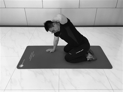 单膝跪地,双手置于脑后,吸气时不动,呼气时转动,注意保持身体稳定。每侧10次,2组。