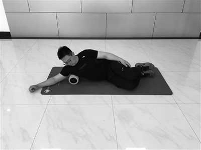 侧卧,单膝压在泡沫轴上,一侧手沿着地面做圆周运动,由侧卧位变成仰卧位。幅度尽可能大,要避免骨盆和膝关节的运动。每侧10次,2组。