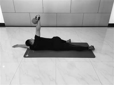此动作有一定的危险性,壶铃可以用矿泉水瓶替代,不需要完全照搬,请量力而行。完成壶铃的滚压,弯曲无负载的肩膀,用它来支撑你的颈部和头部。继续向身体没有重量的一侧翻身,确保膝盖与肚脐成一直线。持握壶铃的手臂必须保持垂直。 当稳定住5秒钟后,可以开始降低壶铃高度,使它紧贴在肩胛骨。这个练习挑战肩带的本体感觉,同时增加胸椎和髋关节的灵活性。 每侧6次,2组。