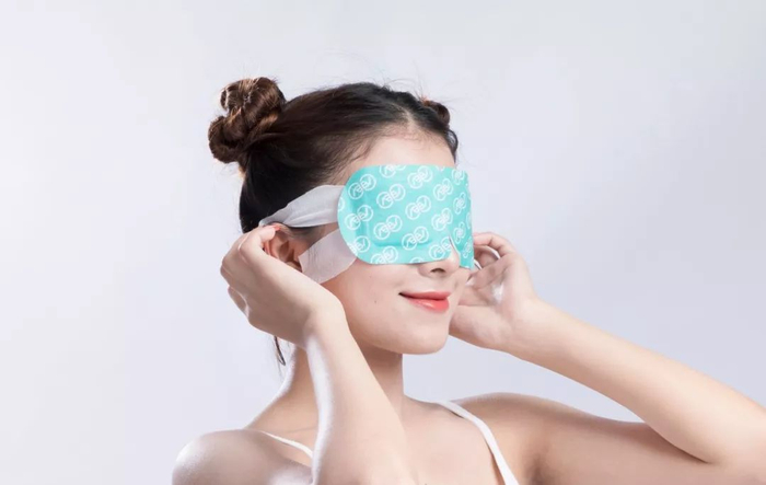 先把眼霜涂抹在眼周,再把蒸汽眼罩戴上,就能躺着睡觉了。