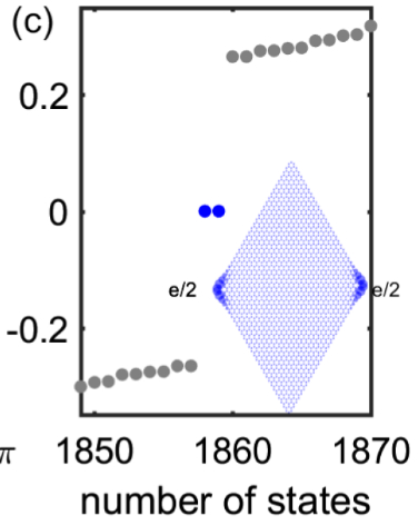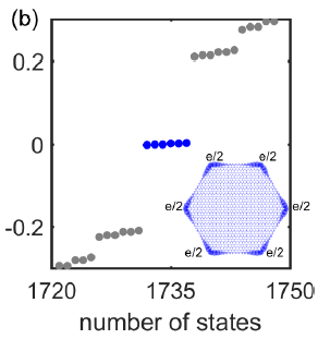 在该文中,乔振华教授与合作者提出一种新的方案来实现从一阶到二阶拓扑绝缘体的操控,即通过在二维一阶拓扑绝缘体上诱导出面内磁矩来实现二维二阶拓扑绝缘体。一阶拓扑绝缘体受时间反演对称性保护;然而,面内磁矩的出现破坏了该对称性,使得拓扑绝缘体变的拓扑平庸。同时,导电的边界态也由于对称性被破坏而变得绝缘不再导电,并且在两个绝缘的边界交界处,出现了零能电子态。具体体系演示如上图所示,在边界的120°的夹角上出现了零能电子态,验证了高阶拓扑绝缘体的出现。值得指出的是,由于体系的有限尺寸,这些角落上的电子态有微弱的耦合,形成一些成键态和反键态,在半填充时,电子在每个角上的电荷分布为元电荷的1/2。