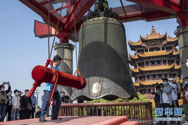 4月29日,抗疫一线代表在武汉黄鹤楼景区重新开放仪式上撞钟祈福。新华社记者 熊琦 摄