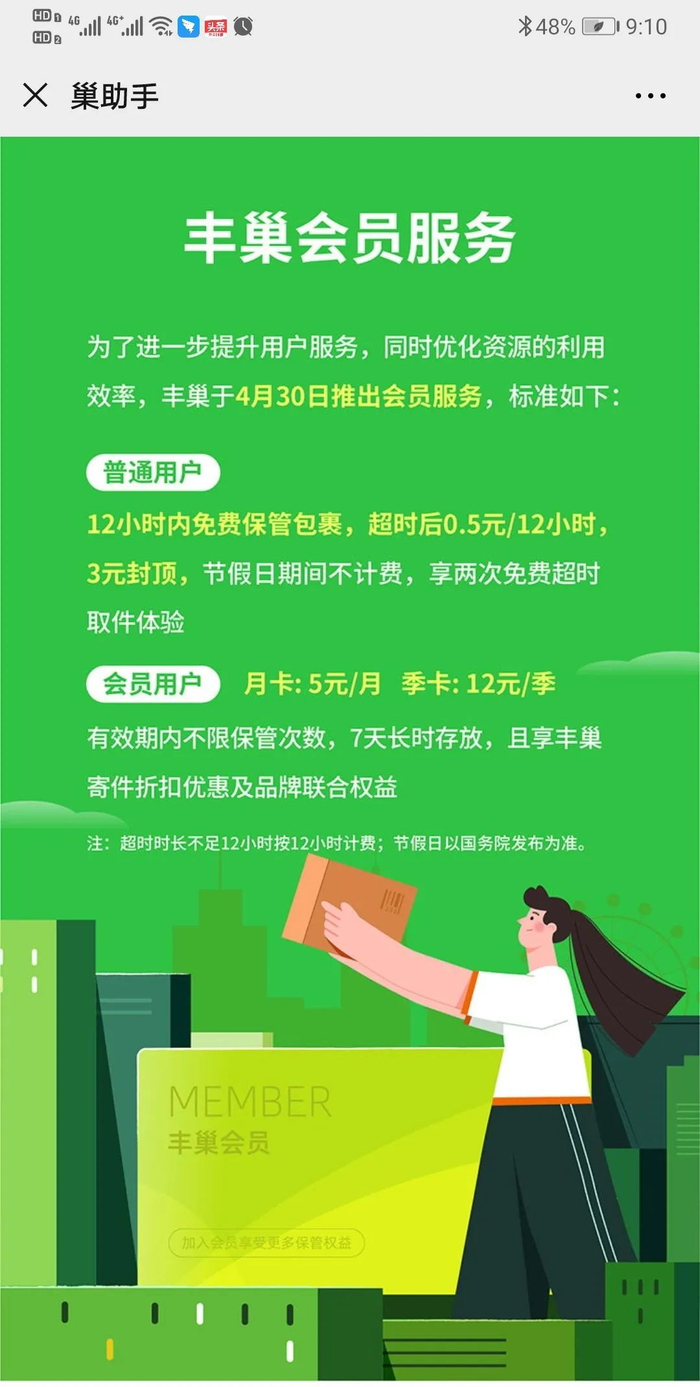 2)丰巢会员:月卡5元/月,不限保管次数,当月任意收件,每件可享7天长时存放,有效时长30天;季卡12元/3个月,不限保管次数,7天长时存放,90有效;