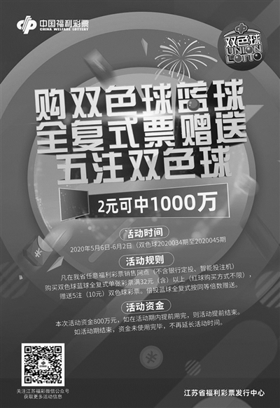 为回馈彩民朋友们对福彩双色球的支持和厚爱,江苏福彩将于5月6日起开展双色球营销月活动,其中,“购双色球蓝球全复式票,赠送五注双色球”,活动资金为800万元。