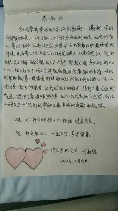 在孩子这期化疗即将结束之时,何先生手写一封感谢信,感谢那些帮助过他的人。“在我全家最无助、最绝望的时候,很多素昧平生的好心人给我的孩子战胜病魔提供了最有力的支持,你们的帮助就像一缕缕最灿烂的阳光,照亮了我们的心怀。”