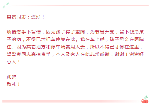 4月15日,陈吉橡在西安交大二附院门口辅道治理违停时发现一辆违停车,便走过去看有没有车主。出乎意料的是,他发现车窗上贴着一张纸条:“烦请您手下留情,孩子得了重病,为了给孩子治病节省开支,不得已将车停靠在此,孩子母亲在医院住,我在车上睡……”。