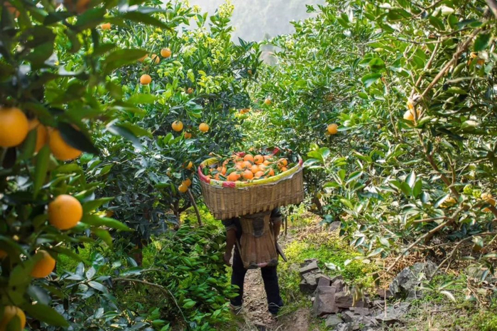 山地险峻无法通车,只能依靠人力,所有的橙子都是果农一筐一筐从山上背下来。