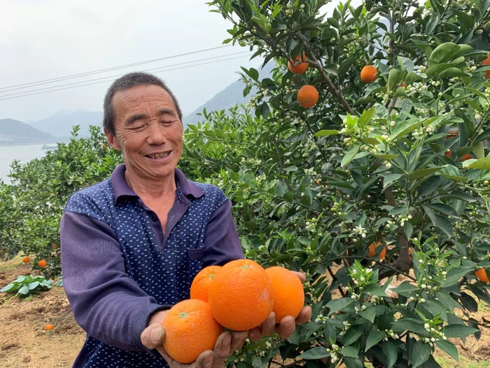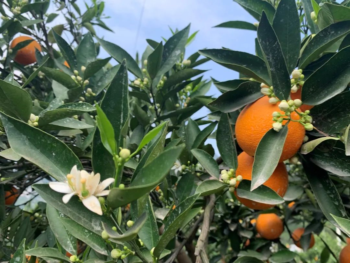 4月的秭归,满山的伦晚脐橙挂满枝头,仔细一看还有一朵朵小花。