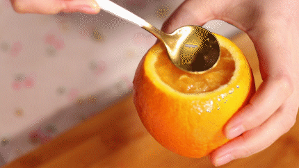 在顶端开一个小口,用勺子压一压,戳一戳,里面的果肉便化在果汁里。