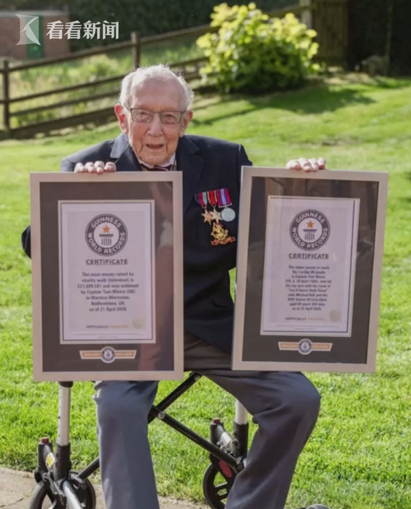 汤姆·摩尔是疫情期间英国的“国民英雄”,他从4月6日开始扶着助行器在自家后院直播散步,为英国战疫一线的医务人员筹款。摩尔最初的计划是在4月30日百岁生日到来前走满100圈,筹款1000英镑,这个目标在16日就提前实现了,但他选择了继续走。截至目前,摩尔还没有停下脚步,筹款数目更是已经突破了2900万英镑。
